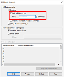 Cochez l'option Définir PIN pour impr., puis saisissez un nombre de un à sept chiffres dans PIN.