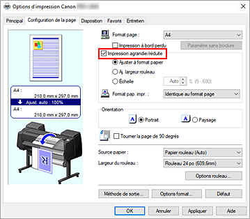 - Si vous effectuez une impression agrandie/réduite alors que l'option Commuter auto. les sources de papier (priorité au format papier) dans l'onglet Réglages périphériques est activée, que Aj. largeur rouleau est sélectionné pour Impression agrandie/réduite dans l'onglet Configuration de la page et que Papier rouleau (Auto) est sélectionné pour Source papier, le rouleau 1 (papier rouleau du niveau supérieur) est toujours utilisé pour l'impression.