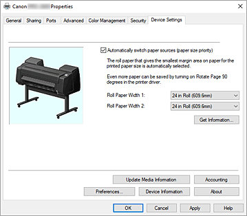 Nota- Se Cambia automaticamente la sorgente carta (priorità formato carta) (Automatically switch paper sources (paper size priority)) è inattivo, consultare "Riflettere le impostazioni dell'unità rotolo nel driver della stampante" e impostare Unità rotolo (Roll Unit) nella finestra di dialogo Info periferica (Device Information) su Sì (Yes).