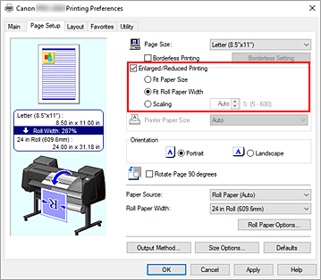 Spuntare Stampa ingrandita/ridotta (Enlarged/Reduced Printing) e selezionare Ad.a larg.carta rot. (Fit Roll Paper Width).