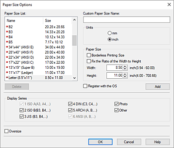 Per diminuire i valori dei formati carta visualizzati in Lista formati (Paper Size List), selezionare la casella di controllo Serie display (Display Series).