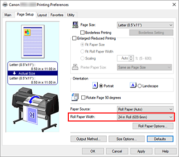 Se você selecionou papel em rolo para Origem do papel (Paper Source), defina Larg. papel em rolo (Roll Paper Width) como a largura do papel em rolo carregado na impressora.