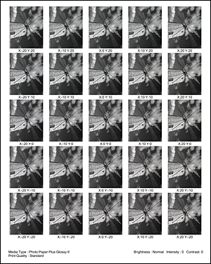 Peržvelkite spausdinimo rezultatus ir išsirinkite labiausiai patinkantį vaizdą. Tada skirtuke Spalvų reguliavimas (Color Adjustment) į X ir Y (monochrominio reguliavimo) laukelius įveskite to vaizdo apačioje nurodytas X ir Y (monochrominio reguliavimo) reikšmes.