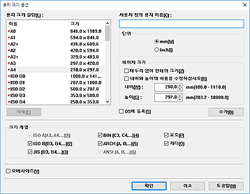 - 비표준 용지 크기에 오버사이즈 용지 크기를 설정하려면 용지 크기 옵션(Paper Size Options) 대화 상자에서 용지 크기를 등록하십시오. 사용자 설정 크기 설정(Custom Size Settings) 대화 상자에서 설정한 용지 크기에는 오버사이즈 용지 크기를 설정할 수 없습니다.