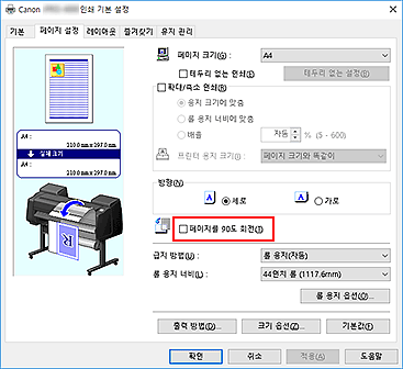 중요- 페이지 설정(Page Setup) 탭에서 배너 인쇄(Banner Printing) 확인란을 선택한 경우 페이지를 90도 회전(Rotate Page 90 degrees)은 회색으로 표시되고 설정할 수 없습니다.