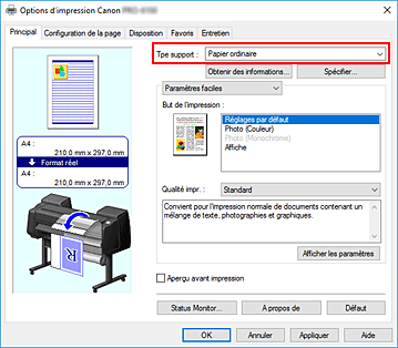 Sélectionnez le type du papier chargé dans l'imprimante dans la liste Tpe support de l'onglet Principal.