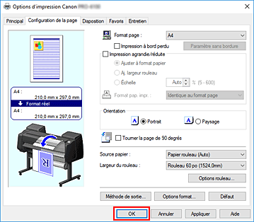 Dans la liste Format page de l'onglet Configuration de la page, sélectionnez le même format que celui du document créé avec le logiciel d'application.