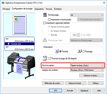 Si vous sélectionnez un papier rouleau dans Source papier, renseignez la largeur du papier rouleau chargé dans l'imprimante sous Largeur du rouleau.