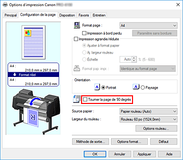 - Lorsque vous sélectionnez du papier au format portrait en tant que Format page dans l'onglet Configuration de la page, si la longueur dans le sens vertical est supérieure à la largeur sélectionnée dans Larg. rouleau, même si l'option Tourner la page de 90 degrés est cochée, la page ne sera pas tournée.