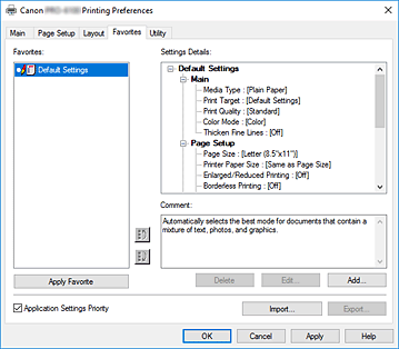 - È possibile modificare le impostazioni di stampa nelle impostazioni del preferito selezionato dall'elenco dei Preferiti (Favorites).