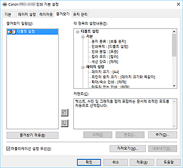 즐겨찾기(Favorites) 탭에서는 자주 사용하는 인쇄 설정을 즐겨찾기로 등록할 수 있습니다.