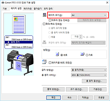 페이지 설정(Page Setup) 탭의 페이지 크기(Page Size) 목록에서 어플리케이션 소프트웨어를 사용하여 만든 문서와 같은 크기를 선택합니다.