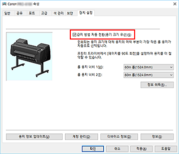 참고- 급지 방법 자동 전환(용기 크기 우선)(Automatically switch paper sources (paper size priority))이 회색으로 표시되는 경우, "롤 용지 유닛 설정을 프린터 드라이버에 반영하기"를 참조하여 디바이스 정보(Device Information) 대화 상자에서 롤 용지 유닛(Roll Unit)을 예(Yes)로 설정하십시오.
