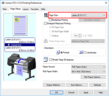 В списке Размер стр. (Page Size) на вкладке Страница (Page Setup) выберите размер, совпадающий с размером документа, созданного в прикладной программе.