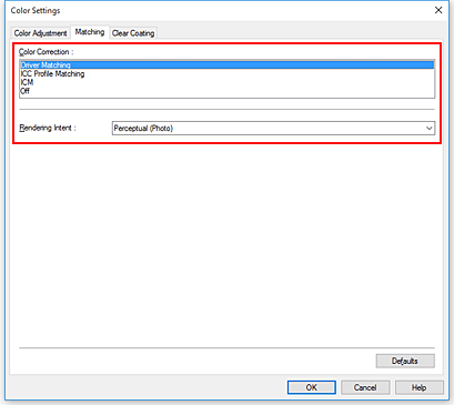 To use driver matching when printing, turn on the printer driver's color correction function. Driver matching accurately applies the characteristics of data displayed on the monitor and allows you to obtain print results of impressions that are close to those displayed on the monitor.