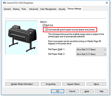 If different types of paper are loaded, an error could occur and you may not be able to print the document as intended. - If roll papers of the same width and type are loaded in the upper and lower levels and the Automatically switch paper sources (paper size priority) check box is selected on the Device Settings tab, Roll 1 (upper level roll paper) will always be used for printing. If roll papers of the same width and type are loaded in the upper and lower levels and you want to automatically switch the roll papers, clear the Automatically switch paper sources (paper size priority) check box.