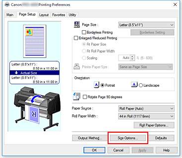 Click Size Options... on the Page Setup tab