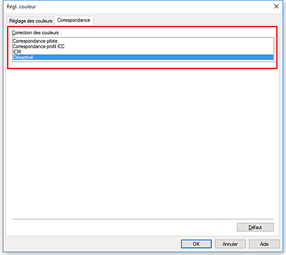 Cliquez sur l'onglet Correspondance et sélectionnez Correspondance profil ICC dans Correction des couleurs.