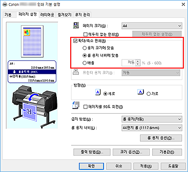 확대/축소 인쇄(Enlarged/Reduced Printing) 확인란을 선택하고 롤 용지 너비에 맞춤(Fit Roll Paper Width)을 선택합니다.