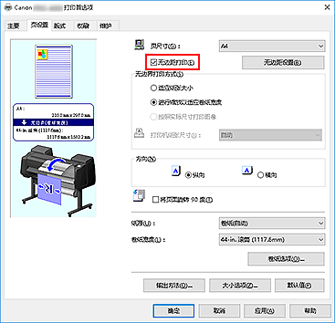 - 如果在无边距打印选项旁添加选中标记,版式选项卡中的页面布局和打印居中选项将显示为灰色且无法设置。