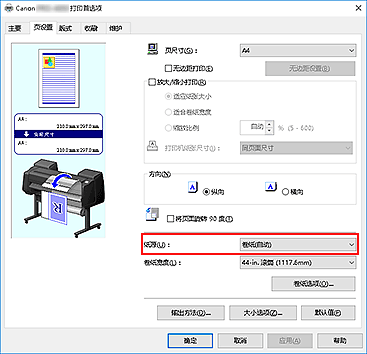 对于纸源选项卡的页设置,从卷纸(自动)、卷纸 1和卷纸 2中选择符合使用目的的设置。