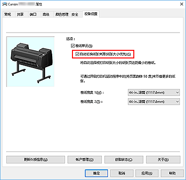 在设备设置选项卡上,选中自动切换纸张来源(纸张大小优先)复选框。