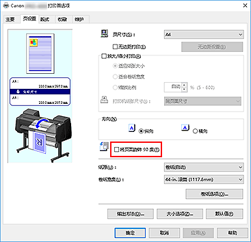 • 页设置选项卡中选择页尺寸为纵向格式的纸张时,如果垂直方向上的长度超过在卷纸宽度中选定的宽度,则即使在将页面旋转 90 度旁添加选中标记,也不会旋转该页面。