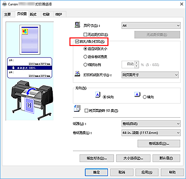 • 启用自动切换纸张来源(纸张大小优先)、在页设置选项卡的放大/缩小打印中选择适合卷纸宽度,并且在纸源中选择卷纸(自动)时,如果执行放大/缩小打印,将始终使用卷纸1(上行卷纸)进行打印。