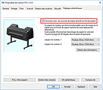 Remarque- Si l'option Commuter auto. les sources de papier (priorité au format papier) est grisée, reportez-vous à « Appliquer les paramètres de l'unité de rouleau dans le pilote d'imprimante » et définissez Unité de rouleau de la boîte de dialogue Info périphérique sur Oui.