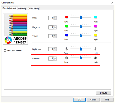 На вкладке Настройка цветов (Color Adjustment) при перемещении ползунка Контрастность (Contrast) вправо контрастность увеличивается, а при перемещении влево –– уменьшается.