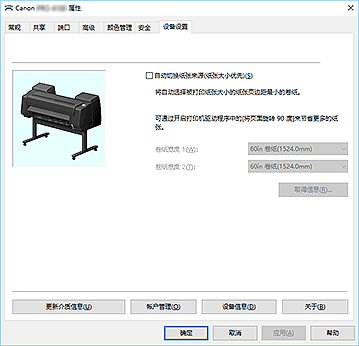- 请务必单击设备设置选项卡中的取得信息...以获取卷纸宽度信息。 如果未正确设置卷纸宽度,可能无法正确打印。