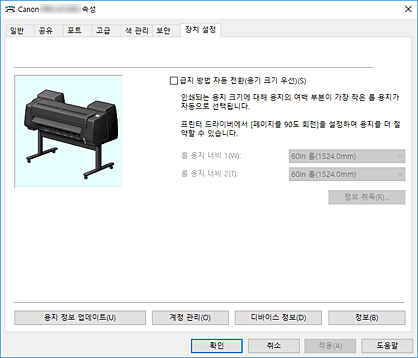 프린터에서 최신 용지 정보를 받아 프린터 드라이버의 용지 정보를 업데이트합니다. - 계정 관리(Accounting)