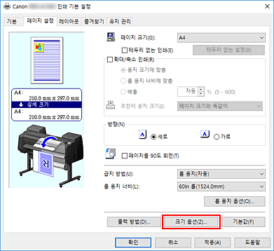 페이지 설정(Page Setup) 탭에서 크기 옵션...(Size Options...) 클릭