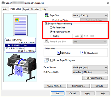 Marque Impressão ampliada/reduzida (Enlarged/Reduced Printing) e selecione Aj. larg. papel rolo (Fit Roll Paper Width).