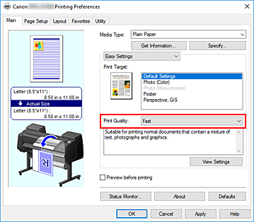 Для параметра Качество печати (Print Quality) выберите значение Высокое (High), Стандарт (Standard) или Быстрая (Fast) в зависимости от цели.