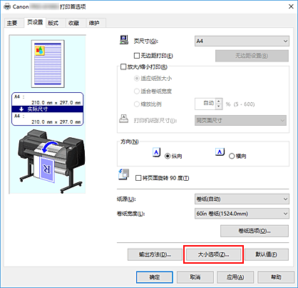 如果想重复使用用户定义纸张,从“大小选项...”中设置更为方便,因为该设置将注册到页尺寸,以便日后可以随时选择。