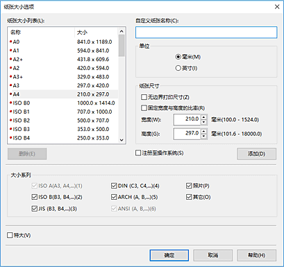 • 应用程序软件关闭后,通过自定义大小设置的任何纸张尺寸将无法再使用。