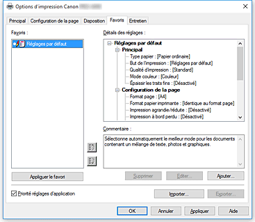 Les réglages du logiciel d'application auront priorité sur les paramètres favoris définis sur le pilote d'imprimante.