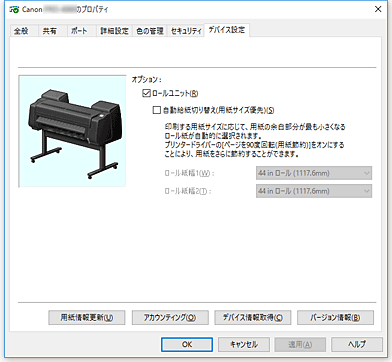 取得した情報に応じて、[ロールユニット]や[自動給紙切り替え(用紙サイズ優先)]、ロール紙幅の設定を自動的に切り替えます。 - [バージョン情報]