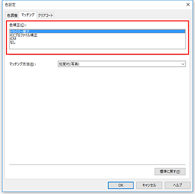 [マッチング]タブをクリックし、[色補正]で以下から目的に合ったものを選び、[OK]をクリックします。