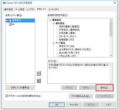 • 現在の印刷設定に適用されているお気に入りの設定は削除できません。[お気に入り一覧]から他のお気に入りを選んで[お気に入りの適用]をクリックし、他のお気に入りの設定を適用してから削除を行ってください。