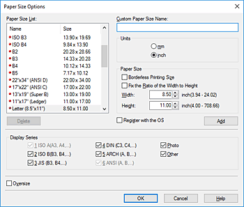 To narrow down the paper sizes displayed in Paper Size List, select the Display Series check box.