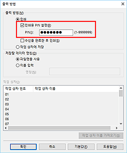 PIN 코드를 인쇄 작업에 설정하는 절차는 여기에서 설명합니다.