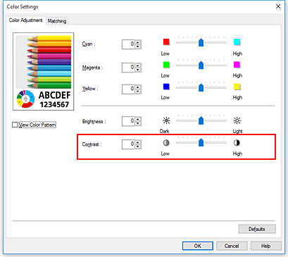 On the Color Adjustment tab, moving the Contrast slider to the right increases the contrast, and moving the slider to the left decreases the contrast.