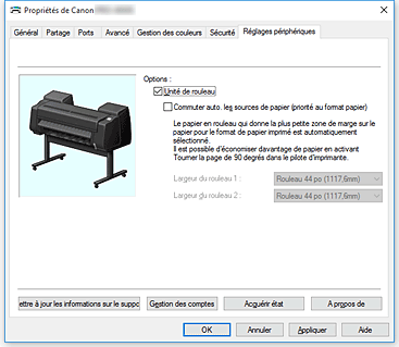 - Pensez à cliquer sur Acquérir état dans l'onglet Réglages périphériques pour obtenir des informations sur la largeur du rouleau. Il est possible que vous ne puissiez pas imprimer correctement si la largeur du papier en rouleau n’est pas correctement définie.