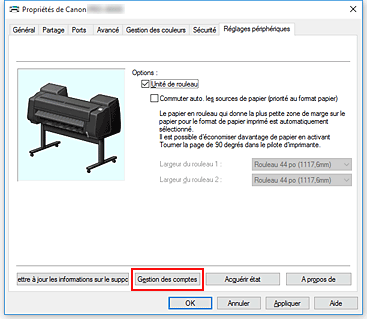 La fenêtre Propriétés (Properties) de l'imprimante s'affiche.Cliquez sur Gestion des comptes dans l'onglet Réglages périphériques