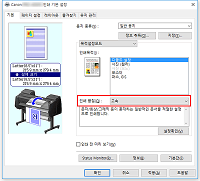 목적에 따라 인쇄 품질(Print Quality)에서 고품질(High), 표준(Standard) 또는 고속(Fast)을 선택합니다.