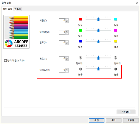컬러 설정(Color Settings) 대화 상자가 나타납니다.대비도 조절