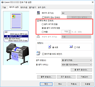 확대/축소 인쇄(Enlarged/Reduced Printing) 확인란을 선택하고 롤 용지 너비에 맞춤(Fit Roll Paper Width)을 선택합니다.