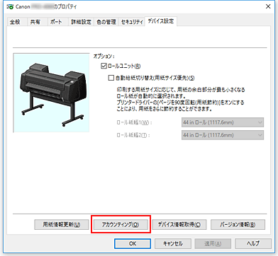 プリンターのプロパティ画面が表示されます。[デバイス設定]シートの[アカウンティング]をクリック